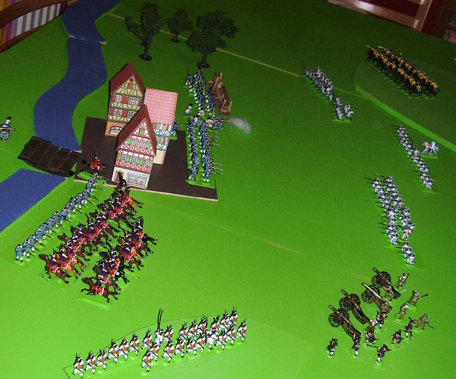 The bluecoats behind the redoubt and in the village have enough cover to counter to numerical advantage of Weinpfalz but the Roqueforts fall understrength and begin to fall back. The artillery piece tries to cover but is lost to a charge by the Rieling Regiment. And after much manoeuvring the Blue Dragoons charge into the withdrawing Roqueforts and ride them down.